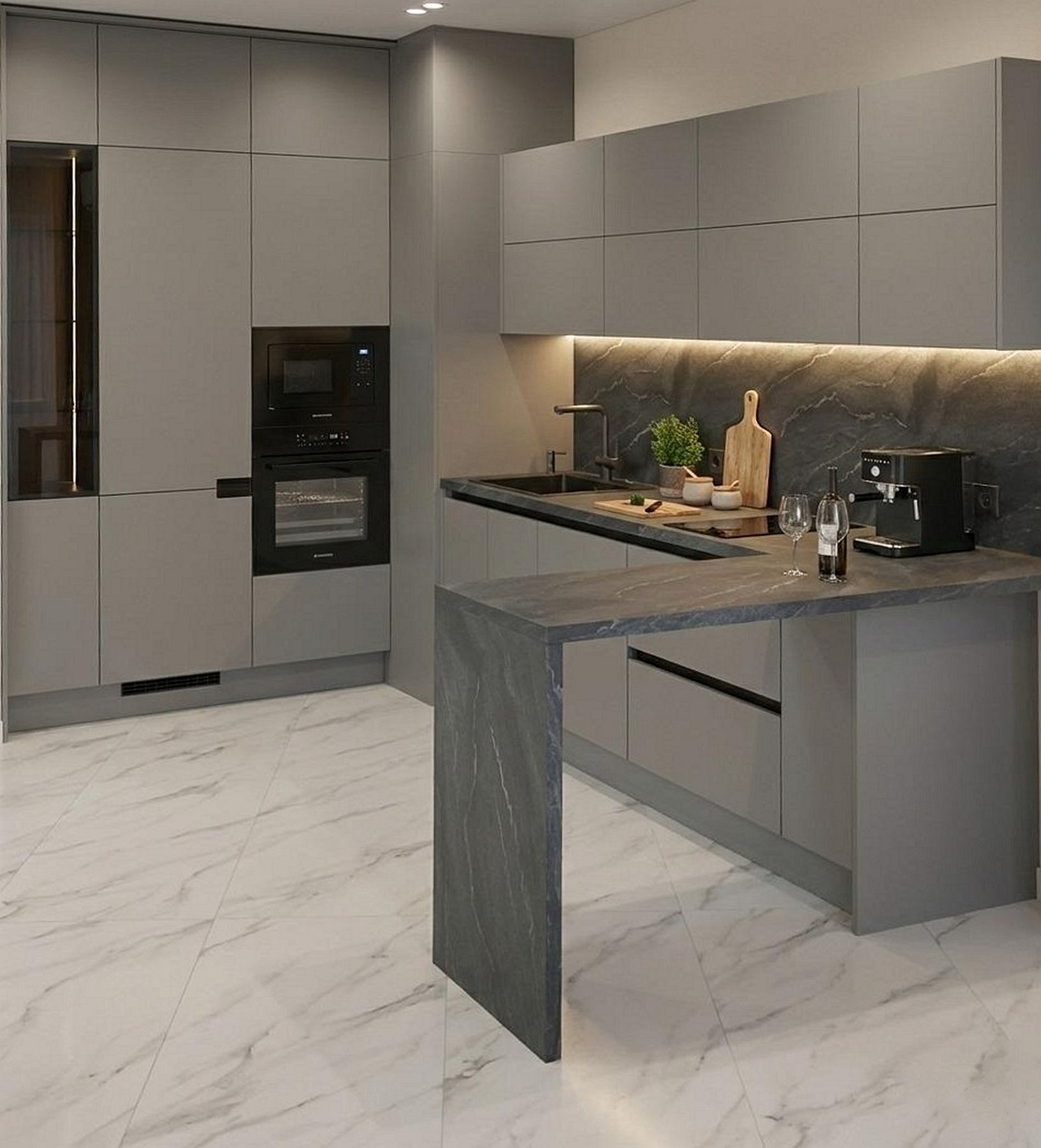 Форма барной стойки может быть любая: угловая, прямая, скругленная. В п-образной кухне это может быть прямая или угловая конструкция, соединенная с нижним рядом шкафов. Если шкафы ставят не п-образно, а линейно или углом, барную стойку размещают так, чтобы сформировать рабочий треугольник.