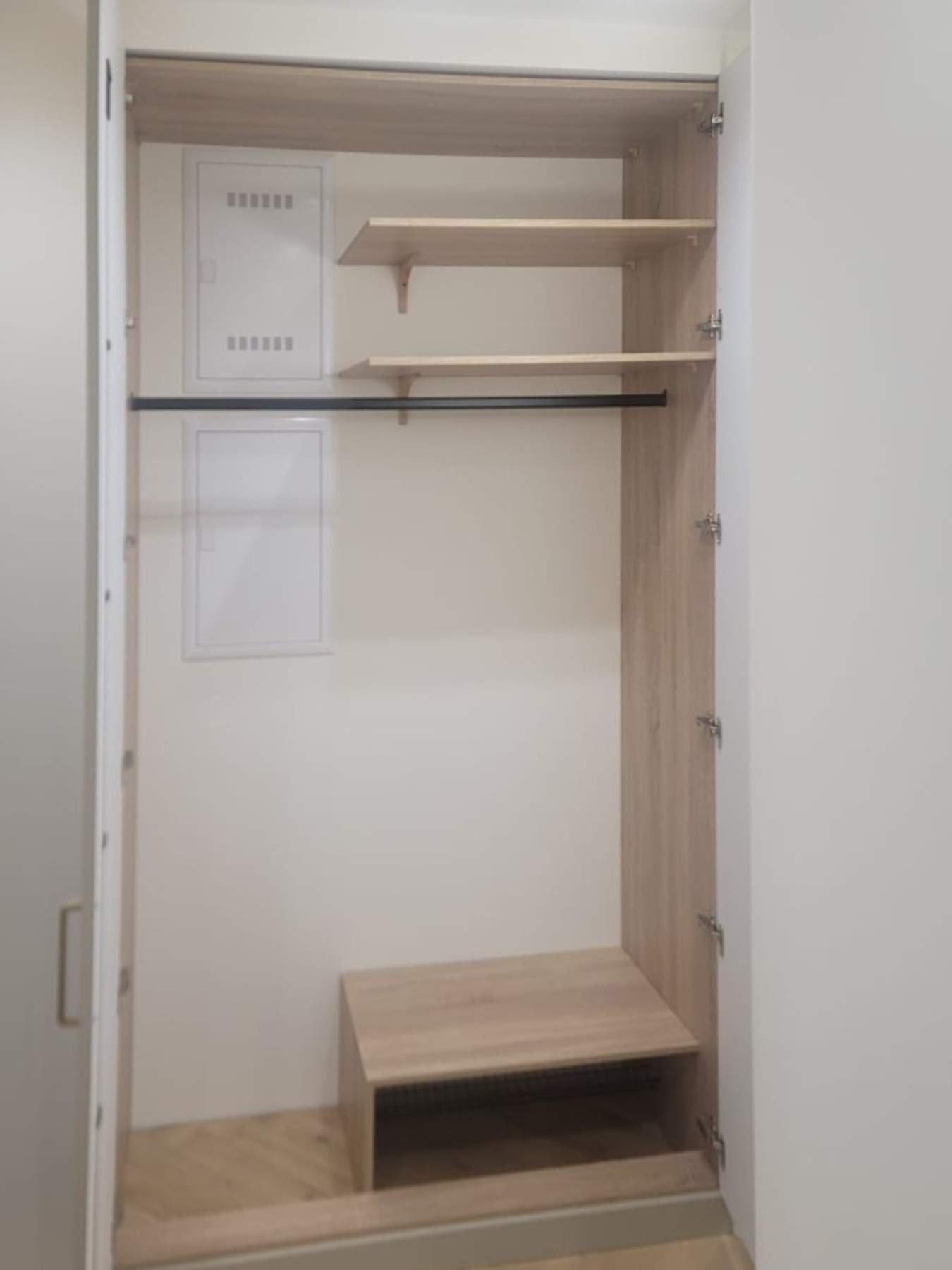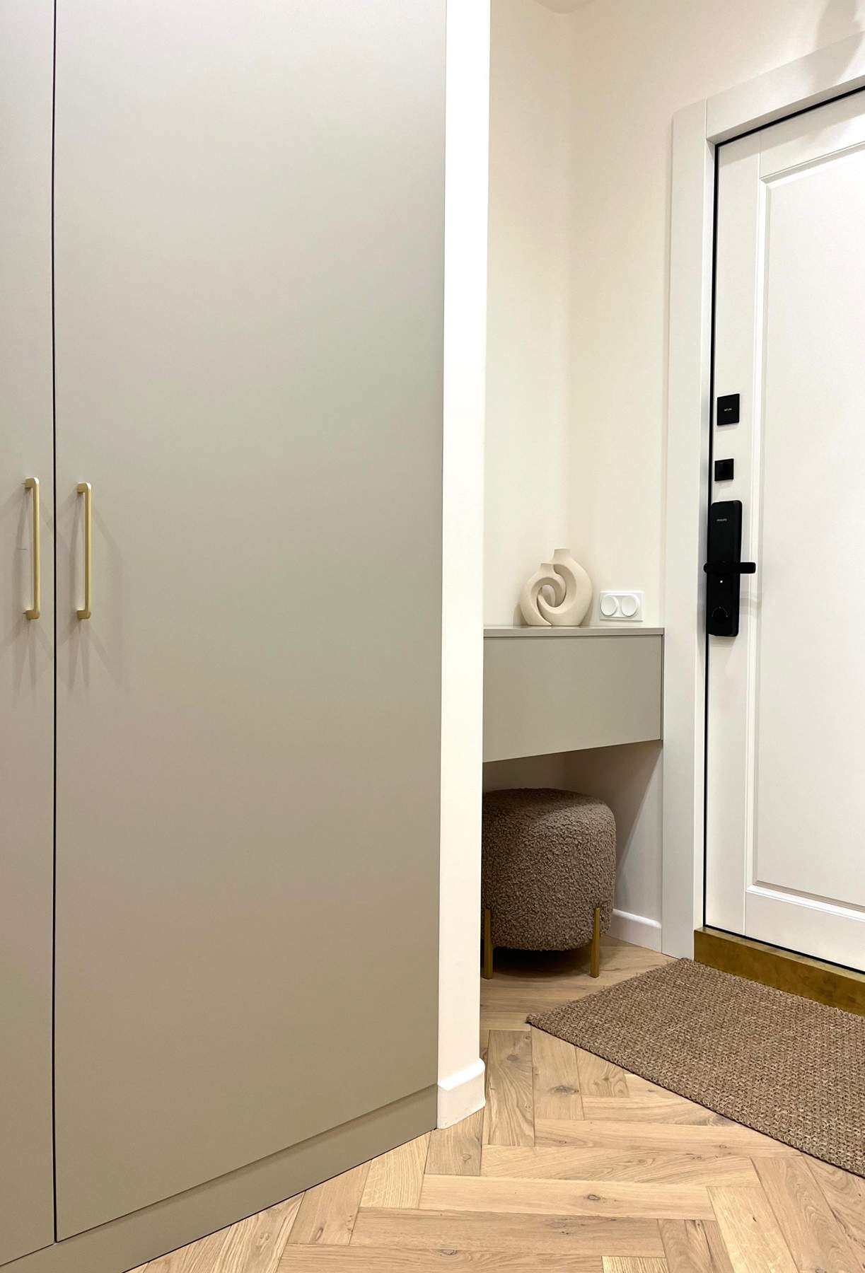 О проектеОписаниеВстроенный шкаф с распашными фасадами в минималистичном стиле отлично сочетается с подвесной тумбой, сделанной из того же материала. Вместе они создают единый образ прихожей. Стиль всей квартиры задается уже на пороге дома.